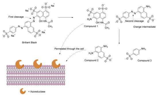 As the number of studies on dye decolorization and degradation increase, it is also important to investigate the mechanism of how azo dyes are being attacked by these bacteria. Brilliant Black, despite having two azo bridges in its structure, is not reduced simultaneously by Dermacoccus abyssi MT1.1T (Figure 2). Most azoreductases of the organism are known to be localized at the cell membrane. It is discussed that the azo bridge between the two naphthalene rings is cleaved first, producing a naphthol-based compound (compound 1) and an orange intermediate, 8-amino-5-((4-sulfonatophenyl)diazenyl) naphthalene-2-sulfonic acid. The orange intermediate, which still bears an azo bridge, is attacked by the azoreductase again and produces the second naphthol-based compound (compound 2) plus sulfanilic acid (compound 3). Compounds 1 and 2 could not be detected, and therefore, it was proposed that they were translocated into the cell membrane [155].