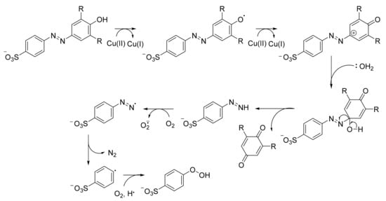 Laccases, on the other hand, are copper-containing enzymes that can oxidize a wide range of aromatic and inorganic substances [182]. The four Cu2+ ions in their active site play an important role in the oxidation of their substrate by taking four electrons from the compound, while the four Cu2+ are reduced to Cu+ [183] (Figure 3). The reduced laccase transfers the electrons to dioxygen and thereby produces water as it returns to its resting state [183] (Figure 3). Meanwhile, the oxidized substrate automatically decomposes into simple products as it has become an active cation radical [183] (Figure 3). Although some oxidized substrates can revert to the original state, ABTS or 2,2′-azino-bis(3-ethylbenzothiazoline-6-sulfonic acid) can be used as a redox mediator for dye decolorization and degradation [184]. Most laccases have also been discovered from fungi such as Pichia pastoris and Trametes versicolor [185,186,187]. However, a small number of reports has shown that bacteria can exhibit phenol oxidase activity on azo dyes, as in the case of Pseudomonas desmolyticum NCIM 2112 [175].