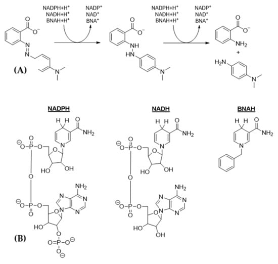 (A) Reduction of the model azo dye substrate, Methyl Red, by an arbitrary azoreductase. Most azoreductases use NADPH or NADH as an electron donor to proceed with the reaction. However, some azoreductases can also use an NAD(P)H mimic, such as BNAH, as an electron donor. (B) Structure of the electron donors that can be used by azoreductases for the reduction of azo dyes.