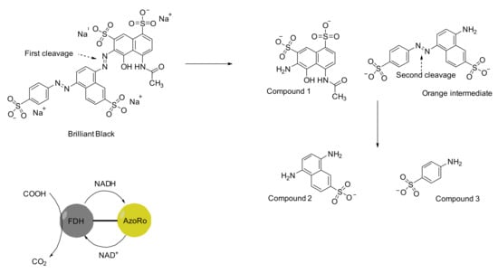 Reduction of Brilliant Black by a fusion protein comprised of the formate dehydrogenase (FDH) from Candida boidinii and the azoreductase (AzoRo) from Rhodococcus opacus 1CP according to an earlier reported observation of respective degradation compounds or intermediates [203].