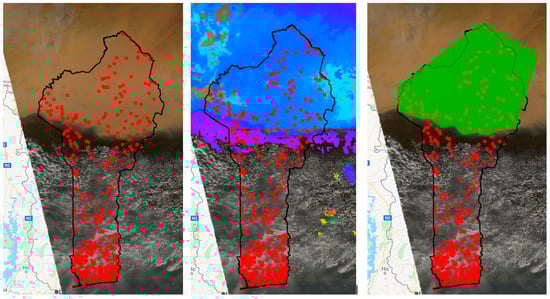 Satellite image of Benin with locations of each PSU (red circles). True-color image of a dust storm in Benin using the MYD09GA.006 Aqua Surface Reflectance Daily Global 1 km and 500 km resolution product (left). The same image with the Terra and Aqua MAIAC Land Aerosol Optical Depth 1 km added as a layer (showing the dust storm in blue, center). The same image with the manually drawn polygon around the dust cloud and indicating the exposed PSUs within the polygon (right).