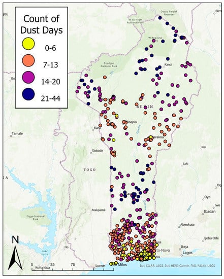 There was dust found in about 10% of the case dates (two weeks prior to the interview date). When examining the time period of four weeks prior to the interview, about 8% of case days were classified as exposed to dust. Figure 2 illustrates the total number of days (between 23 November 2017, and 4 February 2018) where dust was detected for each PSU location. The areas with the highest number of dust days were in northern and central Benin. Southern Benin experienced the lowest number of dust days throughout the study period.