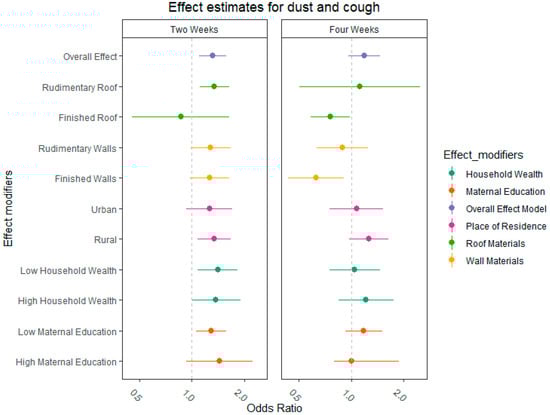 Figure 3 depicts the odds ratios for the two- and four-week periods. We observed an increased risk of cough within the two weeks prior to the interview when a child was exposed to dust (OR: 1.32, 95% CIs: 1.11–1.56). The Cochran Q heterogeneity found no significant differences in the effect modifiers (Appendix A), but there seems to be a general pattern of effect differences. Households with finished wall material were more protected from dust than households with rudimentary wall materials. Moreover, households with finished roofing decreased the risk of cough in children living in them. Children living in rural areas seem to have a higher risk of cough due to dust exposure than children living in urban locations. Similarly, children born in poorer households (1st and 2nd wealth quantiles) seem to be at an increased risk of cough after experiencing a dust storm compared to children from more affluent households; however, this difference is only observed for the two-week exposure period. Mothers’ level of education does not seem to moderate their children’s risk of cough due to dust exposure. Overall, we found inconclusive evidence for longer-term effects (up to 4 weeks) of exposure to dust on the risk of cough.