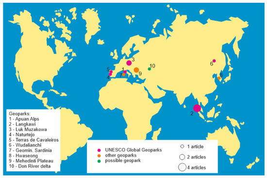 A total of ten geoparks are considered in the analyzed literature. A share of 93% of the articles deal with the already established geoparks, and only Mikhailenko and Ruban [29] address a geopark proposal in Russia. A share of 60% of the considered geoparks are UNESCO Global Geoparks, including the Apuan Alps [42], Langkawi [44,45,46,47], Muskauer Faltenbogen/Łuk Mużakowa [48,49], Naturtejo [50], Terras de Cavaleiros [51], and Wudalianchi [41]. These global geoparks represent five European and Asian countries, of which Portugal hosts two geoparks studied in regard to environmental pollution. One geopark is transnational, belonging to both Germany and Poland, but the experts [48,49] paid attention to its only Polish part. The remaining 40% of the geoparks are not listed among the UNESCO Global Geoparks, although some of them are members of the other international (e.g., the European Geoparks) or national networks. These include such geoparks as the Geomining Park of Sardinia [43], Hwaseong [27], Mehedinti Plateau [52,53], and the possible geopark in the Don River delta [29]. These geoparks represent four countries, both European and Asian.