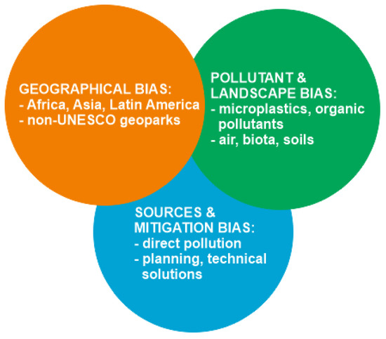 The available knowledge of environmental pollution in geoparks seems to be biased to a significant degree (Figure 4). This knowledge is based on information from several European and a few Asian geoparks (Figure 1), whereas nothing is known about African and Latin American geoparks. Moreover, there are many geoparks in China and other Asian countries [17]; these are exploited intensively for the purposes of tourism, and it is crucial to document pollution (or its absence) from these activities. The examples of the other natural parks and protected areas demonstrate that environmental stress from tourism can be very significant [55,56,57,58,59]. The available knowledge is biased in regard to pollutants and landscape components. Much attention has been paid to trace metals and metalloids, but microplastics are also dangerous and are associated commonly with tourist activities [20,60,61]. Additionally, the natural radioactivity of rocks and groundwater can be related to pollution due to the greater exposure of visitors to geoparks, providing a deeper interaction with the geological environment. Moreover, some geoparks host mining sites where the danger can be even higher. The potential influence of natural rock and groundwater radioactivity on human health is well known [62,63]. Moreover, the information about pollution of air, biota, and soils remains insufficient. Finally, the reviewed literature pays significant attention to pollution unrelated to geoparks, whereas the degree of direct pollution from geopark functioning remains poorly known. The only representative example is the Langkawi geopark, although it seems to be improbable that geoheritage exploitation does not stress landscapes in the other cases. Sustainable planning and the technical side of pollution mitigation are embraced poorly by the considered literature, although the need for them is undisputable in the light of the reported evidence. Apparently, all these biases are interrelated (Figure 4), which indicates the complexity of the unresolved questions.