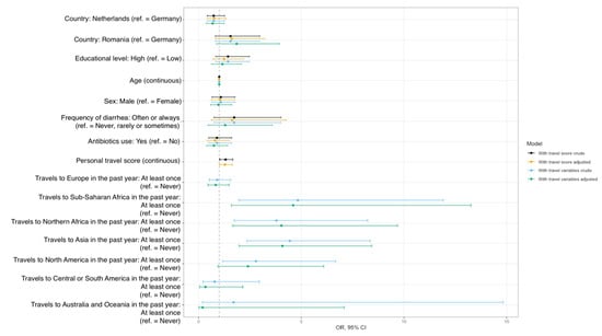 Confirming descriptive and bivariate results, self-reported travel to North Africa, Sub-Saharan Africa, and Asia at least once in the past year were identified as independent risk factors for ESBL-EC carriage in our study population, both in crude and adjusted models (Figure 1). A summary of the adjusted estimates for travel to different geographical areas can be seen in Figure 2.