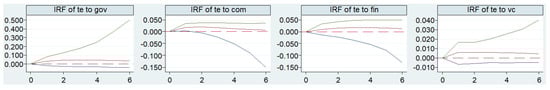 Impulse response function (IRF) can analyze the dynamic effect of a specific variable on itself and other variables after being shocked by one standard deviation while keeping other variables in the model unchanged. Through Monte Carlo simulation 500 times, a response figure of GTIE faced with one standard deviation shock of government financial technology investment, enterprise independent R&D investment, bank technology credit, and venture capital investment was made, as shown in Figure 1. The horizontal axis is the number of impulse response periods, which was set to six periods. The vertical axis represents the response degree of GTIE faced with the impact of government financial technology investment, enterprise independent R&D investment, bank technology credit, and venture capital investment. In Figure 1, the upper and lower lines are the upper and lower bounds of the 95% confidence interval, and the middle curves are the impulse response trace.