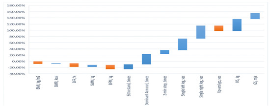 Table 8 and Table 9 show the results of multiple regression model 2, in which the overall explanatory power of all of the independent variables for gait speed was 96.9%, and the adjusted R2 = 90.5%; the overall regression model was significant: F = 36.699, p = 0.001. The independent variables were tested by the post hoc test: BMI β = 0.352, BMR β = 0.316, BFP β = 0.340, SMM β = 0.540, BFM β = 0.398, sit-to-stand β = 4.757, 2 min step β = 6.831, single left leg β = 3.824, single right leg β = 3.833, and up-and-go β = 4.229, indicating that there was a correlation between body composition, sit to stand, 2 min step, single left leg, single right leg, up-and-go. That is to say, the training program that was prescribed in this can effectively evaluate of its effects in combating lower-extremity sarcopenia based on the participants’ body composition.