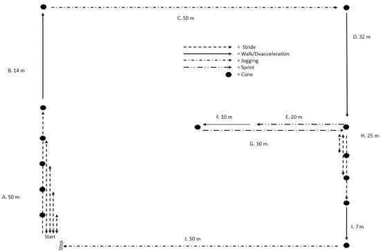 Participants completed a single visit test protocol on artificial grass surface instrumented with a portable O2 analyzer, and three different tracking devices. A pre-determined course consisting of walking, jogging, shuttle run/stride, and sprinting was designed to model the physical requirements in women’s soccer [,]. The course length was 549.5 m and was repeated five times (total distance 2747.5 m) to ensure data sufficiency to measure movement and EEE (Figure 1). Participants were instructed to complete each part of the course at self-selected speeds, guided by movement descriptors. However, the 20 m sprint was instructed to be completed at maximal effort. Before starting the testing protocol, participants were instructed in how to use the Rated Perceived Exertion (RPE) [] scale ranging from 0–10. All participants completed a standardized guided warm up, consisting of three rounds, corresponding to RPE 4, 6 and 8, respectively, the latter being the desired intensity for the completion of the 5-round protocol (self-selected speed corresponding to RPE 8). After each round, they rested standstill for 1 min. Here capillary blood lactate samples were collected, and the participants were asked to rate their RPE of the preceding round. Additionally, after the completion of the protocol, excess post exercise oxygen consumption (EPOC) was measured for 120 s to account for EEE derived work above VO2 max and total session RPE was stated.