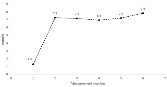 The total distance and mean energy expenditure measured for the tracking devices GPS1, GPS2, and IMU are presented in Table 1. Compared to the manually measured track, results for distance displayed a percentage difference of 4.4%, 3.7%, and 0.7%, respectively. Mean lactate measurement was significantly elevated compared to baseline resting values (1.3 ± 0.4 mmol/L) during round 1–5 (Figure 2).
