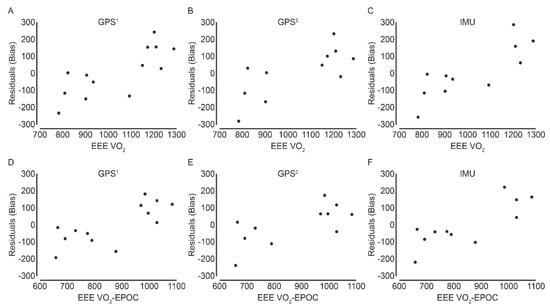 Paired sample t-tests were used to examine for mean differences between the measurement methods, thus indicating the general level of bias. Effect sizes (ES) for these differences were calculated by dividing on the standard deviation of the difference scores corrected for their correlation. We report Hedge’s g, which additionally corrects bias related to smaller samples, thus reducing overestimation according to the formula []: (with J as the Hedge’s g correction factor according to []. The a priori alpha level was set to p < 0.05. We added linear regression analyses to examine the level and direction of systematic biases between the methods. The tracking device in question was used as a predictor with VO2 as the outcome. Unstandardized residuals, which represent the difference between the predicted and the actual VO2 energy consumption score was saved and plotted on the y-axis against VO2 data on the x-axis. Systematic biases would be present if the residual scores showed a non-flat increasing or decreasing pattern depending on the actual VO2 levels. Lastly, we examined if adjusting the EEE calorimetry scores by subtracting the resting time or the EPOC scores could reduce bias and yield better agreement according to new paired sample t-tests, smaller residual scores and improved ICC estimates. All results are presented as mean ± SD, unless specified.
