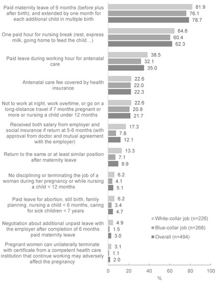 Two thirds of women surveyed were aware of their right to a one-hour breastfeeding break after returning to work, until their child reached one year of age (Figure 1). Fewer women were aware of their rights to paid leave during working hours for routine antenatal care (35.0%); antenatal care fees being covered by health insurance (22.3%); not working at night or overtime or traveling long distances if seven or more months pregnant (21.7%); receiving both salary from their employer and social insurance if they return to work before six months (12.1%); and returning to the same or similar position after maternity leave (9.9%). Few quantitative survey respondents were aware of their rights to: paid leave for abortion, still birth, or family planning (4.7%); negotiate for additional unpaid leave after completion of six months maternity leave (3.0%); and unilaterally terminate or temporarily suspense of their employment contract (2.0%) (Figure 1). Awareness of maternity entitlements tended to be higher among women with white-collar jobs (Figure 1).