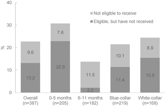 Although most survey respondents took maternity leave (nearly 99%), only 69.3% of women with an infant aged 0–5 months and 86.3% of women with an infant aged 6–11 months had received cash entitlements during their maternity leave (Figure 2). Almost a quarter (22.9%) of mothers with an infant 0–5 months of age who were eligible to receive cash through their contribution to the public social insurance fund had not yet received it (Figure 2).