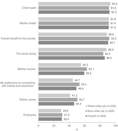 While most respondents strongly agreed that maternity leave policies were beneficial to maternal health (91.5%) and child health (92.5%), society (90.7%), and the family (86.2%) (Figure 3), fewer women felt that the policy was beneficial for: their income (59.5%), connecting with friends and co-workers (49.4%), their career (46.4%), and their employers (30.4%) (Figure 3). Women working in white-collar jobs were less likely to perceive maternity leave as being beneficial for their income, connecting with colleagues, and advancing their career than those working in blue-collar jobs.