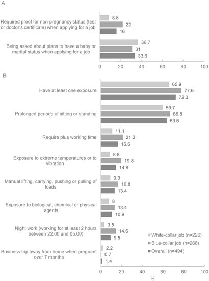 Three quarters of respondents experienced at least one unfavorable condition at work, mostly prolonged periods of sitting or standing. The percentage of women who were exposed to manual lifting, carrying, pushing, or pulling of loads, exposure to biological, chemical, or physical agents, exposure to extreme temperatures or vibration, and night work ranged from 8% to 18% (Figure 4). Less than 3% of participants experienced other hazards or unhealthy conditions and business trips away from home (Figure 4). Women working in blue-collar jobs were more likely to report unfavorable conditions at work (Figure 4).
