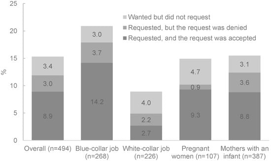 Among survey respondents, 85% did not request a lighter duty because they found that their current job was safe and suitable (Figure 5). The prevalence tended to be higher in women with a white-collar job (91.2%) than those with a blue-collar job (79.1%). Among those who requested a change in their duties, requests were more commonly granted for blue-collar workers (14.2%) than white-collar workers (2.7%). However, across job categories, 6.4% of respondents did not request a change in their duties, despite wanting to, or made a request that was denied (Figure 5).