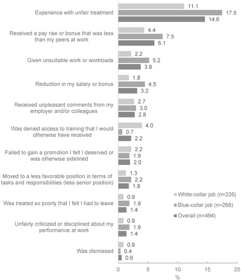 Almost 15% of respondents experienced at least one situation of unfair treatment at work, and the prevalence was higher among women in blue-collar jobs (17.5%) than in white-collar jobs (11.1%). The most common forms of unfair treatment reported were unsuitable workloads, less favorable positions, lower salary or bonus, and unpleasant comments from employers or colleagues (Figure 6).