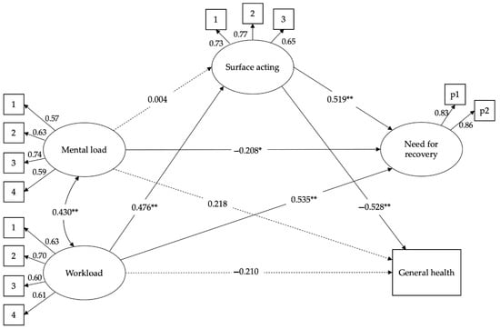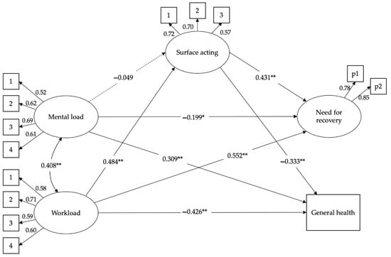 Table 3 for indirect effects). In the front-office model, workload is positively related to surface acting (β = 0.484 **, se = 0.07) and need for recovery (β = 0.552 **, se = 0.07), and negatively associated with general health perception (β = −0.426 **, se = 0.08). In this case, however, the direct effect of workload on worsening the general health perception was significantly greater. Surface acting mediates both the relationships between workload and need for recovery and general health perception. Hypotheses 1 and 2 are confirmed, but only regarding the workload variable. In fact, in both models, the relationship between mental load and surface acting is not significant; therefore, surface acting has no mediation role.