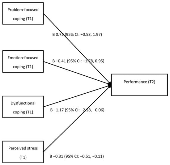 Figure 2 shows the association between three coping subscales at baseline and work performance at follow-up using the regression models. In the multivariate regression analysis, problem-focused coping (β = 0.72 [95% CI, −0.53 to 1.97], p = 0.257) was not significantly associated with work performance, whereas dysfunctional coping (β = −1.17 [95% CI, −2.28 to −0.06], p = 0.039) was inversely associated with work performance. Emotion-focused coping (β = −0.41 [95% CI, −1.78 to 0.95], p = 0.551) was not significantly associated with work performance in bivariate and multivariate regression analysis. In the complete case analysis, these three coping subscales were not significantly associated with work performance, but the trends were similar with multiple imputation models (Table S1).