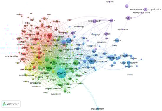 In order to recognize the most common words, we used cluster analysis on a keyword network, which was extracted from the papers. The results are presented in Figure 2, highlighting the words that record the highest frequencies of occurrence: “study”, “pandemic”, “country”, “research”, “innovation”, “data”, “population”, “outbreak”, “government”, “age”, “sex”, “inequality”, “social care”, “treatment”.