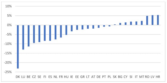 Regarding the change in perceptions between the two moments of time that we analysed, Figure 5 shows that in most states the share of people who agree that the development of a European health policy is a priority in the fight against the pandemic has decreased. A particularly sharp decline is recorded in Denmark, of about 22 percentage points. Thus, the perception of the Danes changed dramatically in just a few months. At the opposite pole are countries such as Croatia, Latvia, Romania, Malta, Italy, Slovenia, Cyprus, and Bulgaria, the only member states for which there has been an increase in the share of people eager for health policy at the European level.
