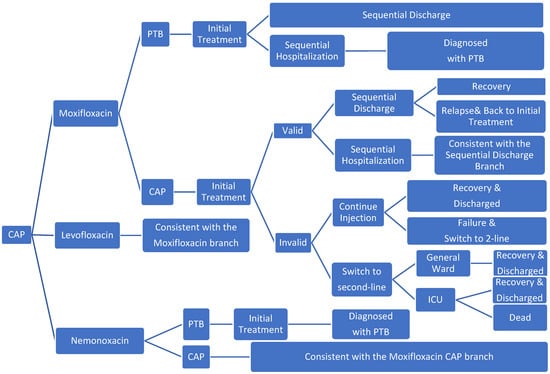 The study population consisted of patients with mild and moderate CAP requiring treatment, which included an estimated 6% of patients with PTB who were misdiagnosed with CAP; all patients received one of the three groups of CAP drugs. After the initial CAP injections treatment, those who responded were to receive sequential outpatient or inpatient treatment; during sequential treatment, patients would receive oral therapies (more details are provided in the Supplementary Materials Table S2). Nemonoxacin has no inhibitory effect on tuberculosis, whereas levofloxacin and moxifloxacin inhibit M. tuberculosis and mask the symptoms of PTB []. Therefore, after the initial treatment of patients with PTB who were misdiagnosed with CAP, patients treated with nemonoxacin were to receive the standard hospitalization treatment for PTB, and the patients in the levofloxacin and moxifloxacin group received sequential CAP treatment. Although levofloxacin and moxifloxacin have been shown to have good anti-tuberculosis effects [,], intensive treatment is needed in the early stage of PTB. Therefore, after the short-term CAP-related treatment, patients with PTB would again show symptoms []. Considering that the effect may be delayed, patients who did not respond to the initial treatment received second-line treatment or to continue to take the original drug treatment. In the second-line treatment, depending on whether the patient’s condition had deteriorated, it was determined whether the patients should be admitted to general wards or ICU wards. After ICU treatment improved, patients were transferred to the general ward for second-line treatment. Patients who continued the original drug treatment entered the second-line treatment if the course of treatment was not effective. In addition, given the likelihood of the recurrence of CAP [,], patients who were cured initially may have been admitted to the hospital again for treatment.