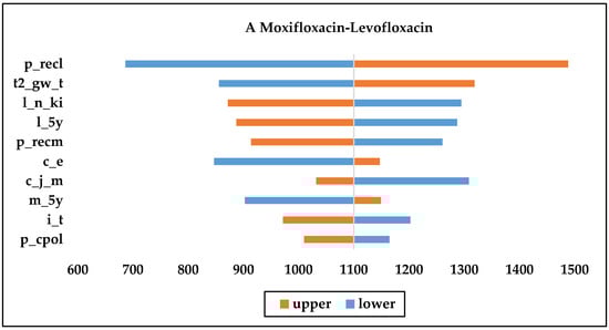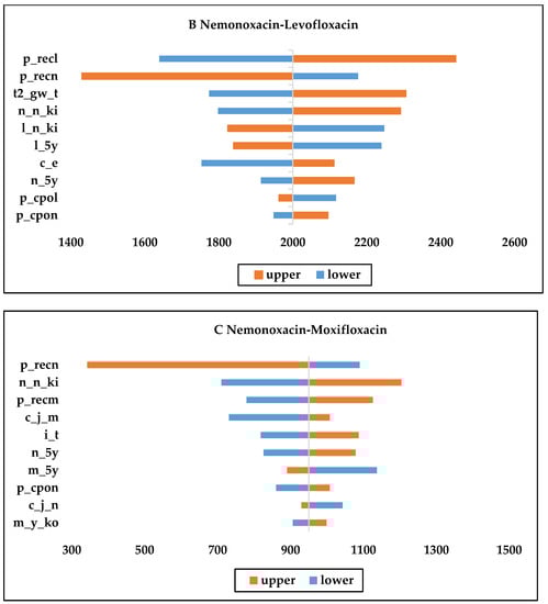 As shown in Figure 2, the recurrence rate, price of injections, and the number of initial treatment days were the most consequential factors affecting the economy of each drug. From the Figure 2B,C, we can see that nemonoxacin had more NMB than the other drugs when the upper and lower limits of each variable were changed; therefore, nemonoxacin can be considered a cost-effective option compared with moxifloxacin or levofloxacin. Moxifloxacin is more cost-effective compared with moxifloxacin or levofloxacin, as Figure 2A shows.