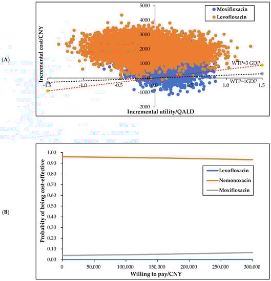 In the scatter plot (Figure 3A), the horizontal axis represents the incremental utilities of nemonoxacin compared with moxifloxacin and levofloxacin and the vertical axis represents the corresponding incremental cost. The dotted lines indicate the values of the two WTPs, respectively, one time and three times per capita GDP. As can be seen from the figure, for moxifloxacin and levofloxacin, 5.28% and 0.03% of all 10,000 points, respectively, at the lower right of the WTP of the three times GDP. That is, compared with moxifloxacin and levofloxacin, nemonoxacin is very cost-effective.