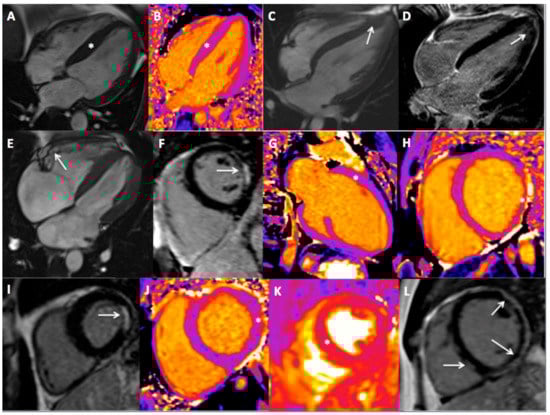 - Patel, A.R.; Kramer, C.M. Role of Cardiac Magnetic Resonance in the Diagnosis and Prognosis of Nonischemic Cardiomyopathy. JACC Cardiovasc. Imaging 2017, 10, 1180–1193. [Google Scholar] [CrossRef] [PubMed]