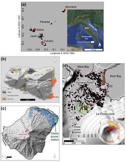Salina, Vulcano and Stromboli islands belong to the Aeolian Archipelago in the Southern Tyrrhenian Sea (Figure 1a), located between Sicily and Calabria (Italy).