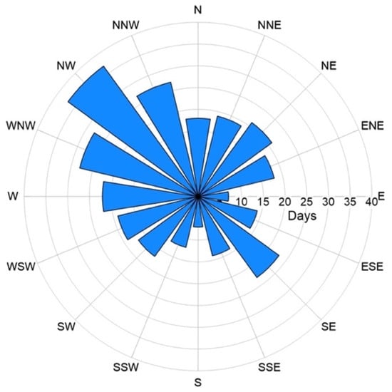 Wind rose diagram showing the prevalent wind direction in the eastern sector of the southern Tyrrhenian Sea [].
