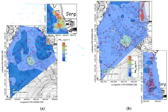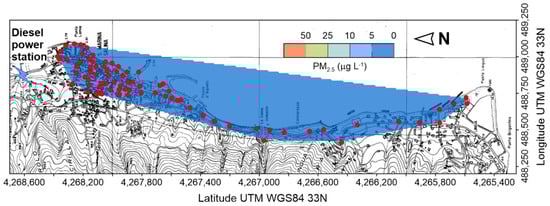 The replicated survey, on November 2021 (Figure 4b), confirmed the presence of higher concentrations along the road, the disappearance of the anomalous area of East Bay, but the appearance of PM2.5 values higher than 10 µg m−3 close to the diesel power station located at the SW corner of the inhabited area. Other single, scattered points with concentrations higher than the average are also present.