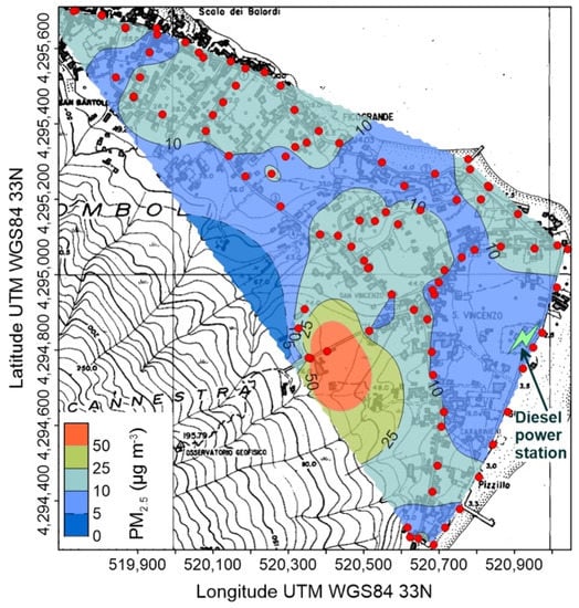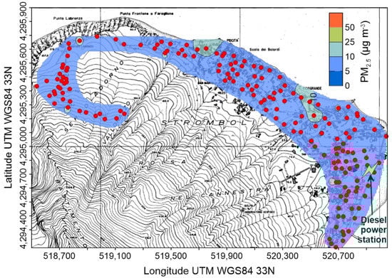 It is worthwhile to note that at Stromboli (Figure 8), the lowest values were observed in the highest part of the village, farer from the most trafficked road but closer to the source of volcanic particulate (the summit vents), indicating that the natural background is much lower than the anthropogenic component.