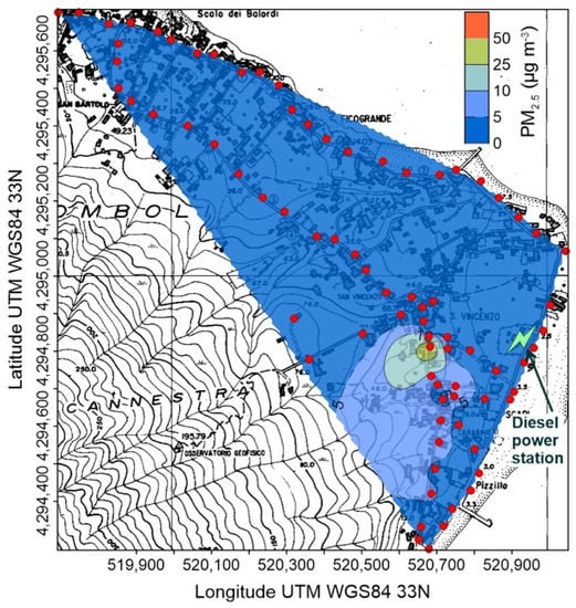 A huge variability of PM2.5 characterizes Stromboli. The highest values were recorded on September 2020 (Figure 5), with wide areas showing concentrations higher than 5 µg m−3, and reaching maxima higher than 50 µg m−3 in the central, uphill zone of the village; it is worth noting that these maxima were recorded shortly after a volcanic explosion from the summit craters.