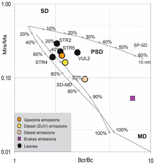 Due to the low values of magnetic susceptibility, indicating prevailing paramagnetic behavior for most of the samples, the hysteresis properties were determined only for the samples with χ > 1 × 10−8 m3/kg, which are STR2, STR4, STR5 and VUL2, as reported in Table 4. Hysteresis loops easily saturated, highlighting prevailing ferrimagnetic behaviour, with coercivities in range with magnetite-like minerals. In the “Day plot” (Figure 9), the points fall in the central-upper area of the diagram, near fuel emissions and far from brakes, comparing the leaves to the exhaust and non exhaust vehicular emissions averaged from Sagnotti et al. [].