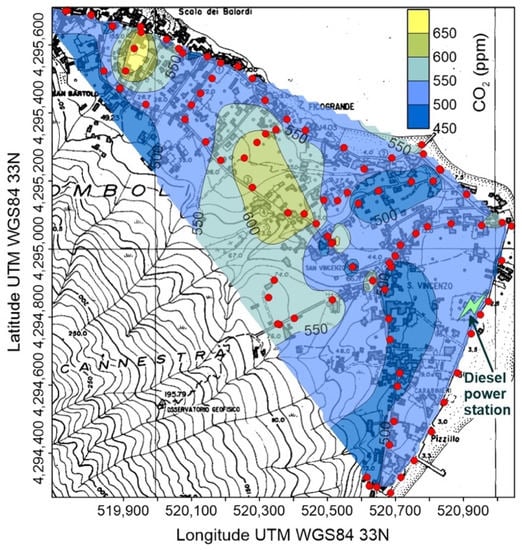 At Stromboli (Figure 10) background atmospheric carbon dioxide concentrations generally exceeded 500 ppm, and two anomalous zones were characterized by values up to 700 ppm. The first one is related to a topographically depressed area immediately downhill of the cemetery, in the central portion of the village. The other one, with the highest concentrations, was located in the N corner of the inhabited area, well known for its anomalous diffuse soil CO2 degassing [].