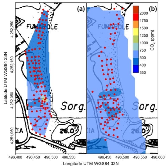 (a) Concentration of atmospheric CO2 in the East Bay of Vulcano Porto area on 13 October 2021; (b) Concentration of atmospheric CO2 in the East Bay of Vulcano Porto area on 13 November 2021.