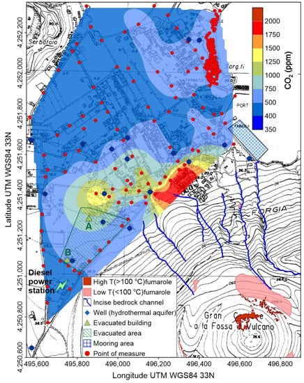 Since the last eruption, volcanic activity has been mainly solphataric, with a main high (T > 100 °C) fumarolic field located in the inner northern flank of the cone, whereas a low (T < 100 °C) temperature ring of fumaroles borders the crater rim (Figure 1d). Another exhaling area is located in the isthmus connecting the main body of the island with the little cone of Vulcanello; here, degassing vents are located both onshore and in the near offshore and due, to the high touristic frequentation of the area, were responsible in the past years of health issues and fatalities, as described in the introduction. Moreover, significant CO2 emissions are also due to intense diffuse soil degassing from other delimited areas inside the Vulcano Porto village [], at whose south termination a diesel power station is also located (Figure 1d).