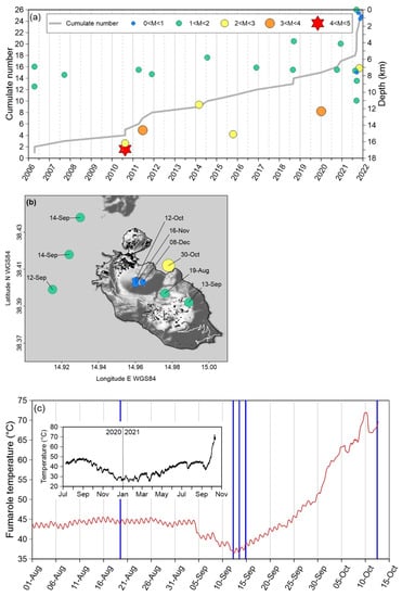 (a) Cumulate number, depth and magnitude of the earthquakes occurred at Vulcano island, and its immediate surroundings, in the period 2006–2021 [,]. (b) Epicentral location, date and magnitude (ML, between brackets) of the earthquakes occurred between August and November 2021 at Vulcano island and its immediate surroundings. The background DEM is from [], earthquakes localization from [,]. (c) Soil temperature (red line), measured at 50 cm depth between August and October 2021, of a fumarole located on the NE rim of la Fossa cone, with indication of the earthquakes occurred in the same period (blue vertical bars); in the inset, fumarole temperature in the period July 2020–October 2021.