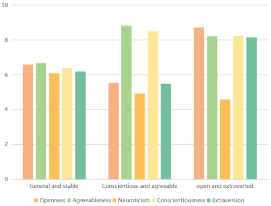The three-profile model, according to the measurement results of the 10-item Big Five Inventory, divides all respondents into three different types of personality portraits, as shown in Figure 1. In total, 79.67% (956/1200) of respondents are typified by having the highest scores of Neuroticism (6.092 ± 1.241) and medium scores of Agreeableness (6.686 ± 1.141), Openness (6.584 ± 1.346), Conscientiousness (6.397 ± 1.316), and Extraversion (6.198 ± 1.398). With little difference in scores between the five personality traits in profile 1, of which this group has the highest proportion, this can be described as the General and Stable type. Then, 9.5% (114/1200) of respondents are typified by having the highest scores of Agreeableness (8.833 ± 0.808) and Conscientiousness (8.5 ± 1.091), medium scores of Openness (5.535 ± 1.506) and Extraversion (5.491 ± 1.746), and the lowest of Neuroticism (4.921 ± 1.63). Compared with the other two groups, Agreeableness and Conscientiousness scored highest. This group can thus be characterized as the Conscientious and agreeable type. Lastly, 10.83% (130/1200) of respondents had the highest score of Openness (8.715 ± 1.163), moderate scores of Conscientiousness (8.238 ± 1.504), Agreeableness (8.215 ± 1.148), and Extraversion (8.154 ± 1.32), and the lowest score of Neuroticism (4.538 ± 1.516). Openness and Extraversion scored highest compared to the other groups. This group can be characterized as the Open and Extroverted type.