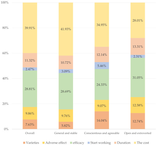 Regarding the percentage importance of vaccine attributes, the General and Stable and the Conscientious and Agreeable types of respondents considered vaccine cost to be the most important and vaccine efficacy to be the second most important attributes. This was consistent with the percentage importance of attributes perceived by all respondents. At the same time, it is also consistent with the general preference of the Chinese public in a study on the hesitation of the Chinese and American public to vaccinate against COVID-19. However, the Open and Extroverted type was the opposite of the other two types, with this type considering vaccine efficacy to be the most important and vaccine cost coming in second place. We speculate that this was because of the higher Extroversion scores in this type. The need for contact and socialization with other people is higher in Extroverted individuals [62], so the effectiveness of the COVID-19 vaccination in protecting respondents from normal social contact was of greater concern in this type.