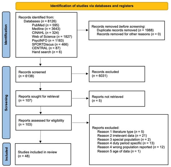 The 48 studies involved a total of 36,958 participants, included in 46 cross-sectional studies and three clinical trials (Figure 2). The characteristics of the included studies are summarized in Appendix A. Across all studies, males represented 96% of participants. The mean age of participants was 40 ± 11 years according to 35/48 studies which reported the mean age. The most prevalent age range reported in the remaining studies was 35–45 years. Twenty-five studies reported self-report subjective data, 14 utilized a combination of self-report subjective and objective data, and five reported only objective data. The included studies were conducted in 20 different countries or regions, including Brazil (five), China (five), New Zealand (four), Finland (three), Indonesia (three), Sweden (three), the United Kingdom (three), the United States (three), Korea (two), the Netherlands (two), Portugal (two), and one study each from Arab states, Australia, Europe, Germany, India, Oceania, Saudi Arabia, Spain, and Thailand. Four studies involved participants from numerous countries.
