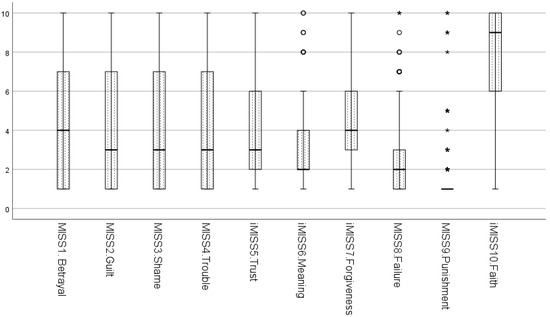 Boxplots of ten items of G-MISS-HP. Note. G-MISS-HP—Moral Injury Symptom Scale for Health Professionals, German version; MISS5i, MISS6i, MISS7i, MISS10i—inverted items scores due to positive wording.