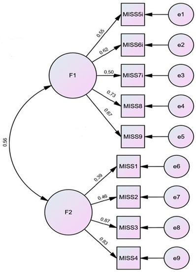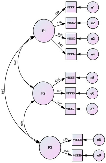 Unlike all the other items, which had corrected item–total correlations above the recommended value of 0.30 [38], MISS10 had a poor negative corrected item–total correlation (−0.07). Therefore, it appeared that, this item should be methodically excluded from the scale. Once we excluded item MISS10, we proceeded with the analysis of item scores for MISS1, MISS2, MISS3, MISS4, MISS8, and MISS9, and inverted item scores MISS5, MISS6, and MSS7.