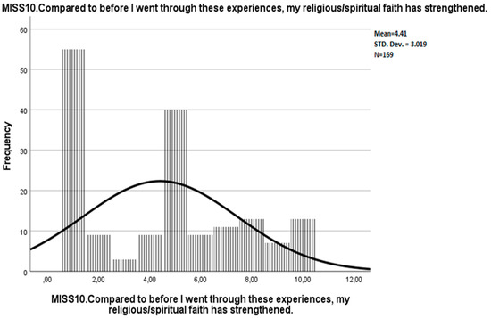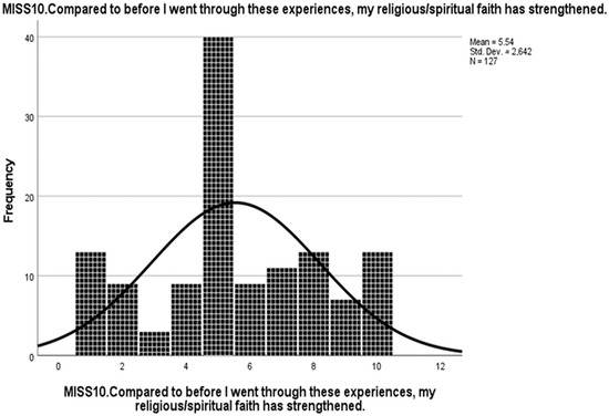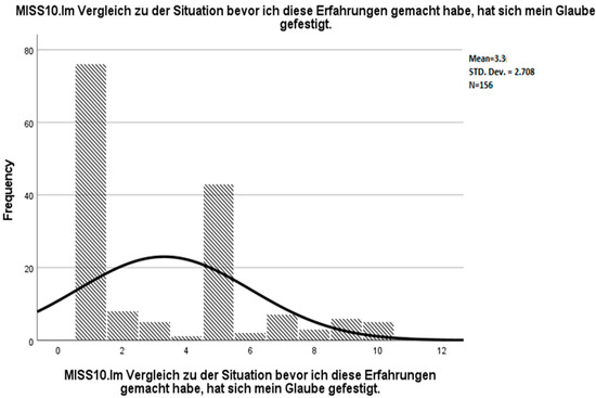 Courtesy of the authors, we obtained the raw data from the study by Mantri et al. [19]. In addition, we inspected the frequency distribution of MISS10 in the dataset (see Figure 5). Thereby, we noticed a considerably large number of missing values regarding this variable. The dataset comprised two different types of item non-responders: “the participant did not even see the question (e.g., had started the survey but did not hit the “next page” button)” and “the participant saw the question but did not answer”. We assumed that the considerable proportion of the participants in the latter group might not have responded to the item due to a lack of personal religious affiliation. Moreover, if the missing values of “saw the question but did not answer” were assigned a value of 1 (fully disagree), then the frequency distribution of the item score would be very similar to the frequency distribution in the present study (see Figure 6 and Figure 7). Therefore, different ways to deal with potential item non-responders in English and German versions had possibly contributed to the inconsistencies regarding the suitability of MISS10 for the instrument.