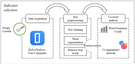 The process of indicator selection. This figure shows the whole process of indicator selection in this paper. After crawling the text, this study processes the patient comments through three text preprocessing methods, and then analyzes it through the co-word semantic network.
