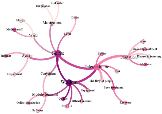 It can be seen from Figure 2 that the three keywords of telemedicine, service and intelligence define the discussion framework of the existing wise medical system. At the same time, these three high-frequency words also reflect the overall characteristics of wise medical in Zhejiang Province. From the perspective of telemedicine, wise medical transfers part of the medical treatment process online through digital means, such as online appointments, autonomous operation of machines and equipment, electronic reports, electronic medical records, etc. This model can reduce the flow of people in hospitals and shorten patients’ travel time, thereby reducing carbon emissions; from the perspective of service, the wise medical model includes scientific planning of department divisions in the hospital structure, optimizing the offline medical treatment process. With strengthened management of wards and medical staff, the comfort of the patient’s medical experience can be improved, and their recovery time can be shortened. At the same time, the energy required for hospital operation, such as hot water supply, canteen catering insulation, etc. has also been optimized in the energy structure and can meet low-carbon standards. From the perspective of the keyword wisdom, this invokes a combination of many wise medical features, and is closely connected with electronic means and medical service systems. Digital medical means can provide many online platforms, give patients more information and convenience, and enable patients to access more medical resources at home. At the same time, wisdom also means scientific management of the above resources and natural resources through participatory management [31].