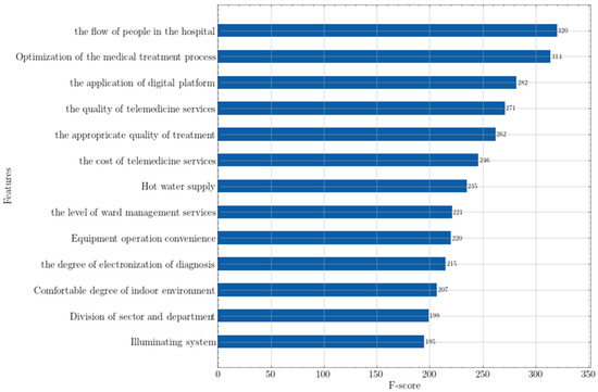 While classifying predictions, the XGBoost model can also calculate the feature importance, which is used to measure the influence of an indicator on the label variable. There are three main methods for calculating feature importance: gain, weight, and cover. The importance was calculated in this study using the method of weight, which interprets the importance score as the number of times each feature appears in the boosted tree, that is, the number of times the feature is used as a split node [30]. Due to the difference in the degree of use and sensibility of patients in medical services, the universality and influence of different aspects of medical service quality were divided into primary and secondary. The score was used to measure the impact of each wise medical impact indicator on the final overall satisfaction; the higher the score, the more important the impact of the indicator on the overall satisfaction with the hospital. Therefore, it is the area that highlights the main patient experience differences in many aspects of service quality.