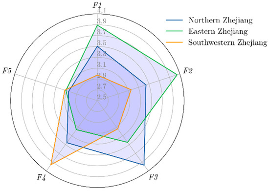 The construction level of wise medical in various regions of Zhejiang Province. F1, F2, F3, F4, and F5 represent the optimization of the medical treatment process, the construction of digital platforms, the flow of people in hospital, the quality of telemedicine services, and the appropriate quality of treatment, respectively.