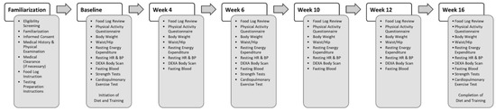 This study utilized a randomized, parallel, prospective intervention within a university-based research setting. This research protocol was approved by the Texas A&M Human Participant Protection Board (IRB2010-0130F) in accordance with the Declaration of Helsinki [23] and registered with clinicaltrials.org (#NCT04372771). Data were collected before and after 4, 6, 10, 12, and 16 weeks of intervention (see Figure 1).